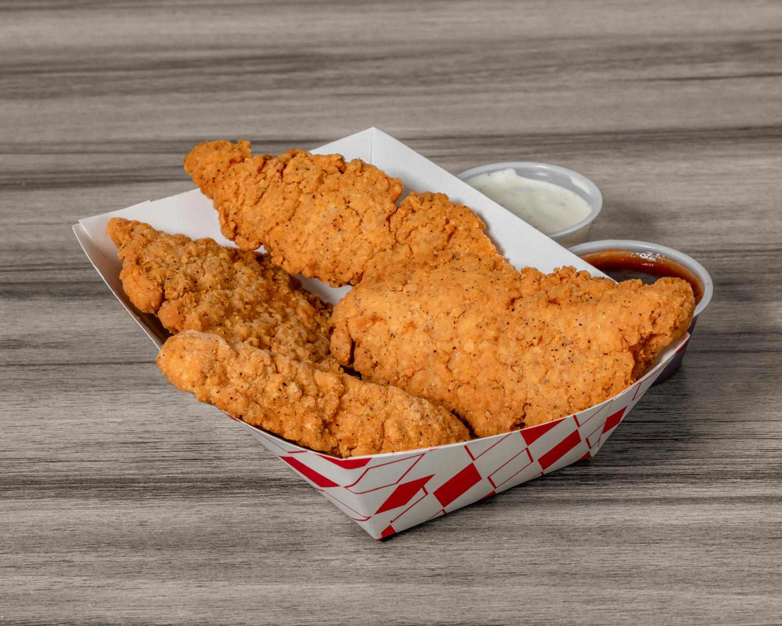 Crispy golden chicken strips, juicy on the inside, served with a rich dipping sauce.